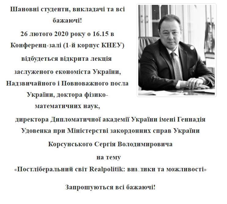 - 26.02.2020 р. відбудеться відкрита лекція на тему «Постліберальний світ Realpolitik: виклики та можливості». Запрошуються усі бажаючі!