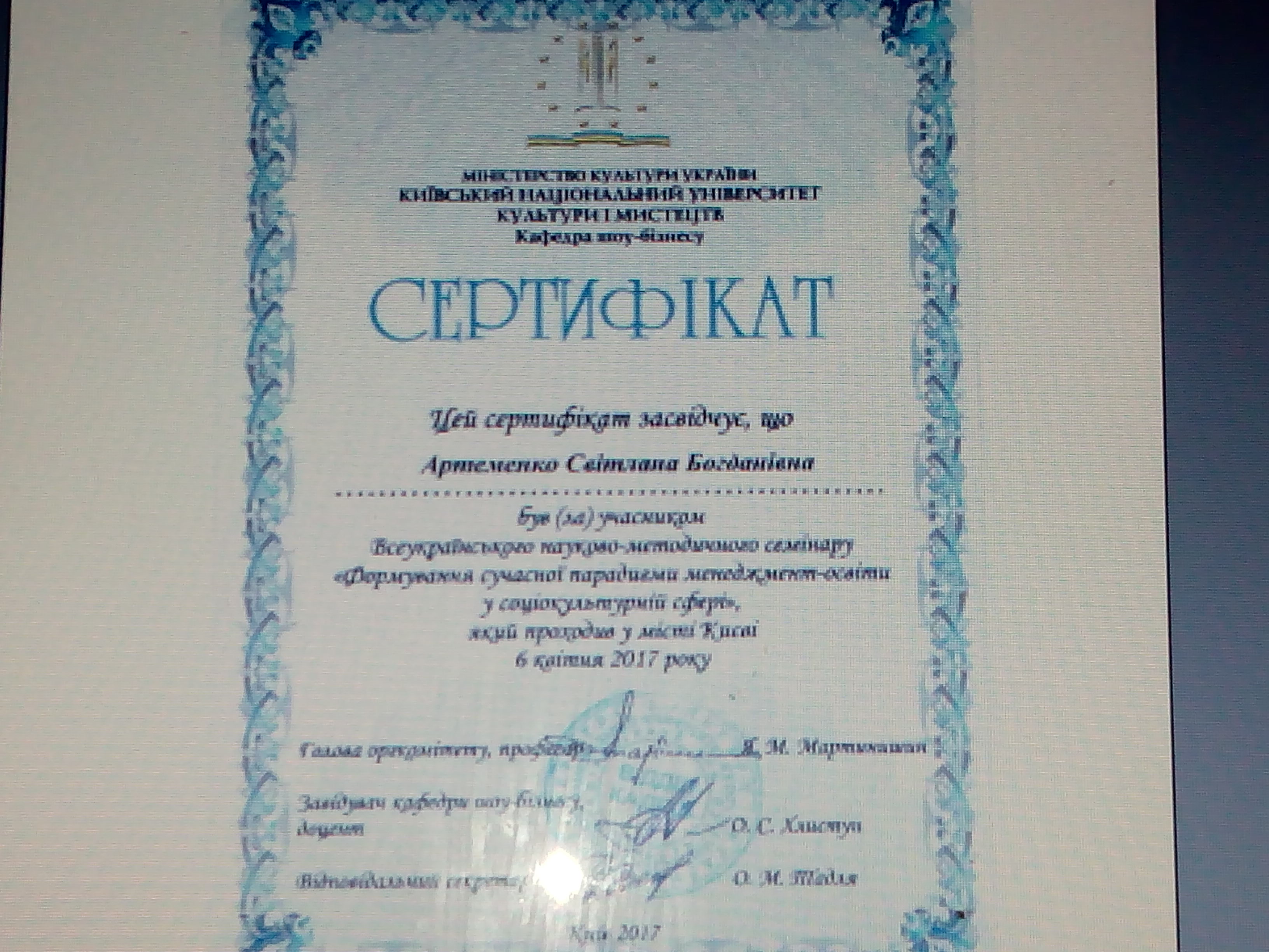 Заступник завідуючої кафедри, доц. Артеменко С.Б. 6 квітня 2017 року прийняла участь у науково-методичному семінарі кафедри шоу-бізнесу КНУКіМ "Формування сучасної парадигми менеджмент-освіти у соціокультурній сфері".