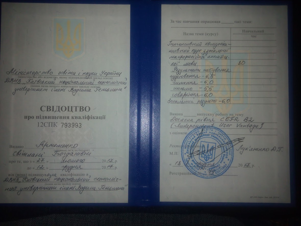 18 грудня 2017 рокузаступник завідувачки кафедрою соціології, доц. Артеменко С.Б. отримала свідоцтво підвищення кваліфікації державного зразка, що підтверджує рівень володіння англійською мовою В 2 згідно шкали Ради Європи за програмою «Інтенсивний комунікативний курс із загальної та професійної англійської мови» в Науково-освітньому центрі інтенсивного навчання іноземних та української мов «ІНТЕНСИВ» при ДВНЗ «КНЕУ імені Вадима Гетьмана».