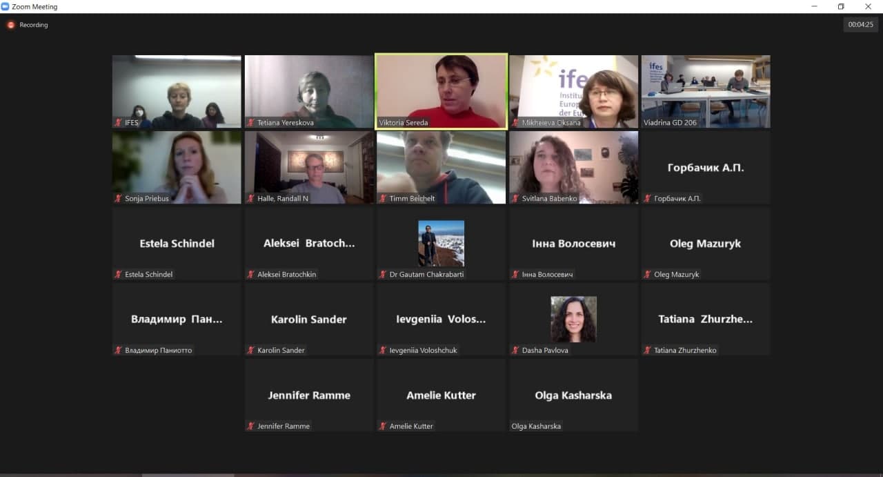 23 листопада 2021 р.доцент кафедри соціології, к.соц.н., доц. Єрескова Тетяна Володимирівна прийняла участь у он-лайн семінарі “Researching society at war: Ukrainian case in the nexus between annexation and armed conflict” з обговорення методологічних та етичних питаннь проведення соціальних досліджень у суспільстві під час війни, організованому Інститутом Європейський досліджень (IFES) та Факультетом соціальних та культурних досліджень European University Viadrina (Німеччина). Модератором заходу була Д-р Сьюзан Воршех, політичний соціолог, Інститут європейських досліджень Віадріна (IFES), Європейський університет Віадріна. Дискутантом була Оксана Міхєєва, д.і.н., запрошений професор DAAD у Європейському університеті Віадріна, Франкфурт (Одер).