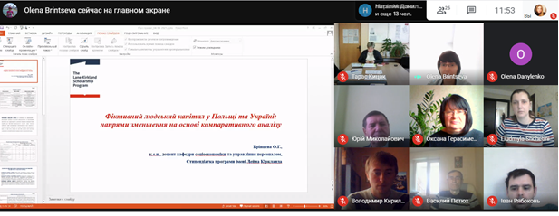 Наразі усі мали нагоду ознайомитися з роботою Брінцевої О.Г., к.е.н., доцента кафедри соціоекономікита управління персоналом, стипендіатки програми імені ЛейнаКіркланда на тему "Фіктивний людський капітал у Польщі та Україні: напрями зменшення на основі компаративного аналізу".