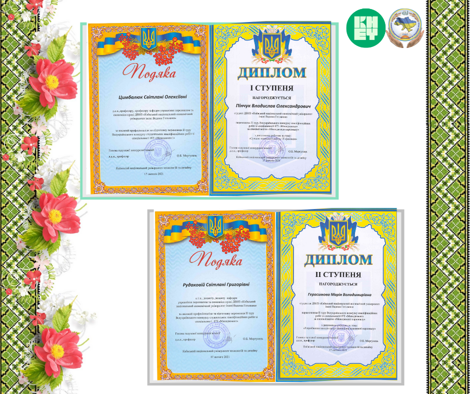 Кафедра пишається і щиро вітає з перемогою у ІІ турі Всеукраїнського конкурсу кваліфікаційних робіт зі спеціальності 073 «Менеджмент», освітньої програми «Менеджмент персоналу» наших студентів: