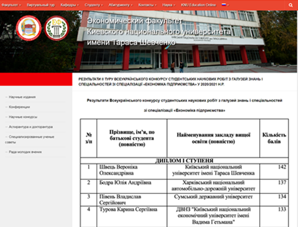 Пишаємося здобутками нашої студентки Турової Карини Сергіївни, яка взяла участь у II турі Всеукраїнського конкурсу студентських наукових робіт з галузей знань і спеціальностей зі спеціалізації «Економіка підприємства», котрий проводився, відповідно до наказу Міністерства освіти і науки України від 24.11.2020 року № 1457 на базі Київського національного університету імені Тараса Шевченка.